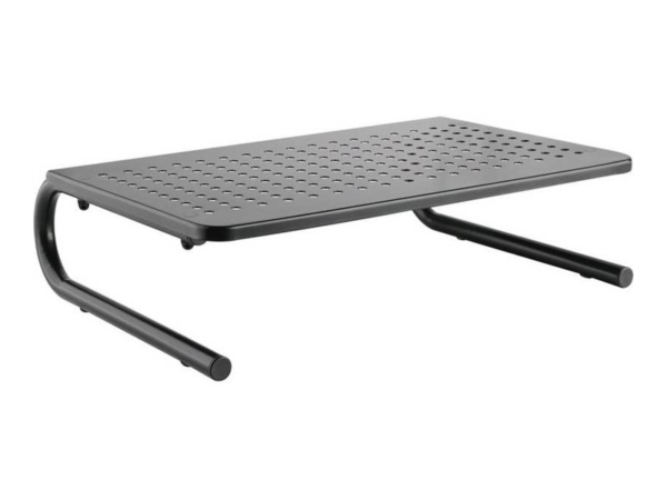 Design ergonómico Este suporte para monitor eleva os ecrãs a uma altura adequada, promovendo uma postura mais saudável e reduzindo a tensão no pescoço durante o uso prolongado.; Construção robusta Fabricado em epóxi, o suporte suporta um peso de até 20 kg, proporcionando estabilidade para monitores maiores e garantindo durabilidade em ambientes movimentados.; Estrutura ventilada Com o seu design perfurado, este suporte para monitor permite a circulação do ar em torno dos dispositivos eletrónicos, evitando o sobreaquecimento e mantendo as condições ideais de funcionamento.