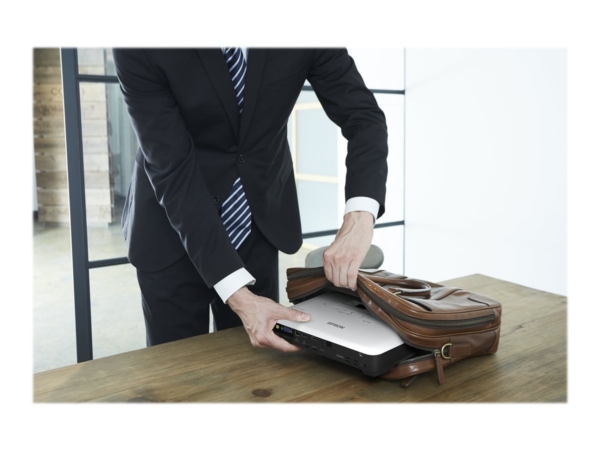 Qualidade de imagem excecional Desfrute de uma excecional qualidade de imagem, cores naturais impressionantes com White e Colour light output igualmente elevados de 3.200 lumens graças à tecnologia Epson 3LCD. A tecnologia True Colours oferece uma reprodução fiel das cores tal como elas são e, com uma relação de contraste de 10.000:1, as imagens projetadas são nítidas e bem definidas.; Configuração rápida A correção Keystone vertical e horizontal automática e o Ajuste do ecrã facilita a instalação do projetor em praticamente qualquer lugar. A relação de projeção de curta distância projeta uma imagem de grande dimensão a uma distância mais curta para todos os participantes na reunião poderem estar sentados atrás do projetor, uma vez que a ventilação dianteira direciona o calor em direção ao ecrã. A Função de ligar automática liga o projetor quando deteta a entrada de sinal e o NFC facilita a ligação aos dispositivos móveis através da conectividade Wi-Fi incorporada.; Apresentações mais inteligentes A funcionalidade Apresentador por gestos permite aos utilizadores avançar numa apresentação diretamente com as mãos. Veja duas origens de dados lado a lado com ecrã dividido, ao mesmo tempo que partilha facilmente conteúdos de dispositivos móveis através do espelhamento do ecrã. A conectividade MHL permite mostrar conteúdos de áudio e vídeo de alta qualidade a partir de dispositivos móveis, ao mesmo tempo que os carrega.; Verdadeira portabilidade O fator de forma ultrafino e o design leve fazem deste o projetor ideal para o utilizador móvel. É incluída uma mala de transporte, com o projetor a caber facilmente numa mala de portátil convencional.