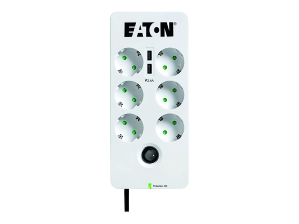 Proteção fiável contra picos de tensão A Eaton Protection Box protege eficazmente os seus aparelhos electrónicos contra picos de tensão, assegurando que funcionam em segurança e permanecem protegidos.; Conectividade de múltiplos dispositivos Equipado com 6 saídas USB-A, este protetor contra picos de tensão permite a ligação simultânea de vários dispositivos, aumentando a eficiência do carregamento.; Conformidade com as normas O produto cumpre várias normas internacionais, como a ISO 9001, ISO 14001 e IEC 60884-1, garantindo qualidade e segurança.; Potência de saída robusta Com uma potência de saída total de 2500 W, este protetor contra picos de corrente garante que os seus dispositivos recebem energia suficiente para um desempenho ótimo.; Design de fácil utilização O fator de forma externo permite uma colocação e acesso fáceis, simplificando a ligação e desligamento de dispositivos conforme necessário.