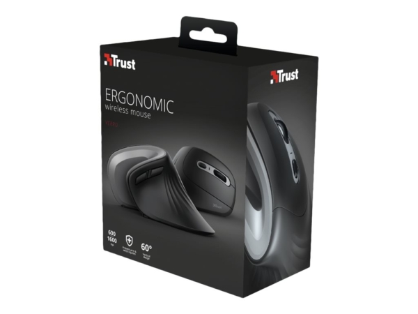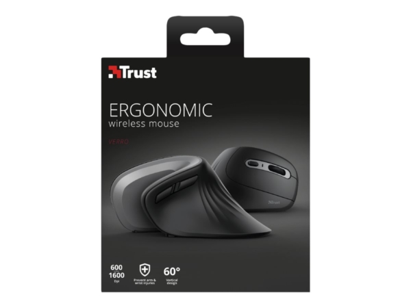 Design ergonómico confortável A forma vertical do Trust Verro promove uma posição natural da mão, reduzindo a tensão e o desconforto durante uma utilização prolongada.; Maior precisão de movimentos Com a tecnologia de deteção ótica de movimentos e uma resolução de 1600 DPI, os utilizadores podem esperar um seguimento e uma resposta precisos nas suas tarefas.; Tecnologia sem fios flexível Utilizando uma interface sem fios de 2,4 GHz, este rato permite que os utilizadores operem até 10 m de distância do recetor, oferecendo uma ampla mobilidade.; Disposição cómoda dos botões O rato possui seis botões, incluindo uma roda de deslocamento, proporcionando praticidade para várias tarefas e acesso fácil a funções essenciais.; Ajuste rápido da sensibilidade A função de comutação de sensibilidade em tempo real permite aos utilizadores alternar entre as definições de 600, 1200 e 1600 DPI sem esforço, para um controlo ideal.
