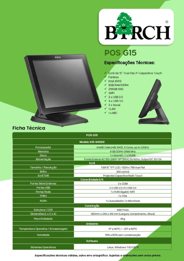 - POS BIRCH G15 15.0” INTEL J6412 QUAD-CORE 8GB 256GB SSD (BRC) – NOVO