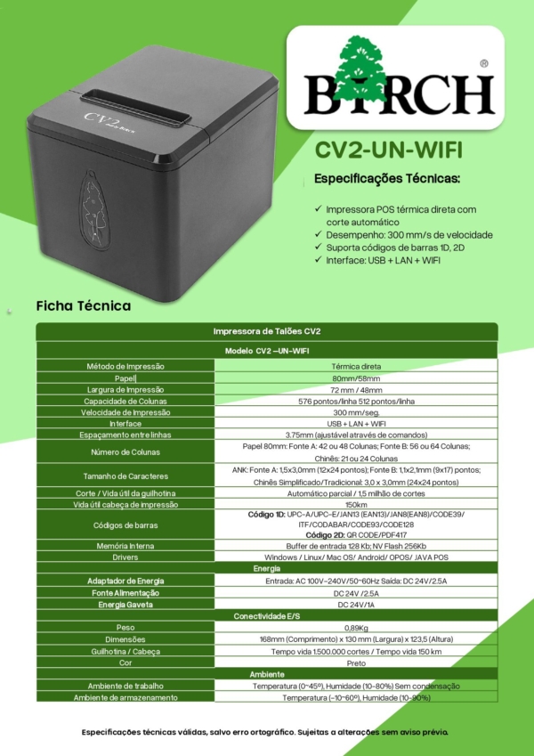 - IMPRESSORA POS TÉRMICA BIRCH CV2-UN PRETA USB+Ethernet+WIFI (BRC) – NOVO
